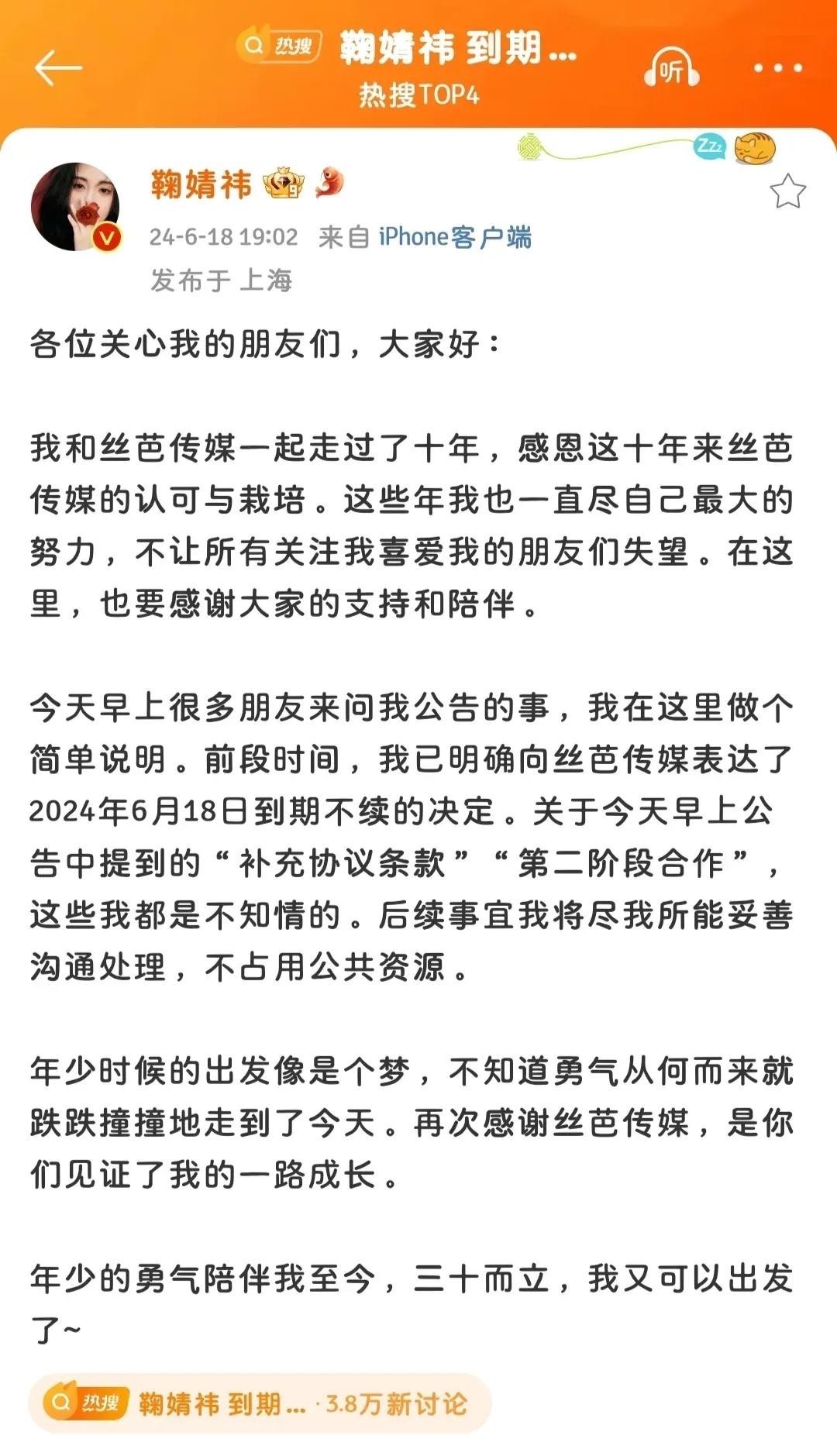 早在2024年,合约临近到期,鞠婧祎发文解约,控诉公司伪造签名续约。