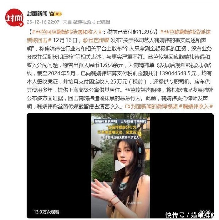 没想到,鞠婧祎硬刚,声称1.39亿包含团队运营成本,不是她个人净得分成,实际到手没这么多,但具体多少她也没说。